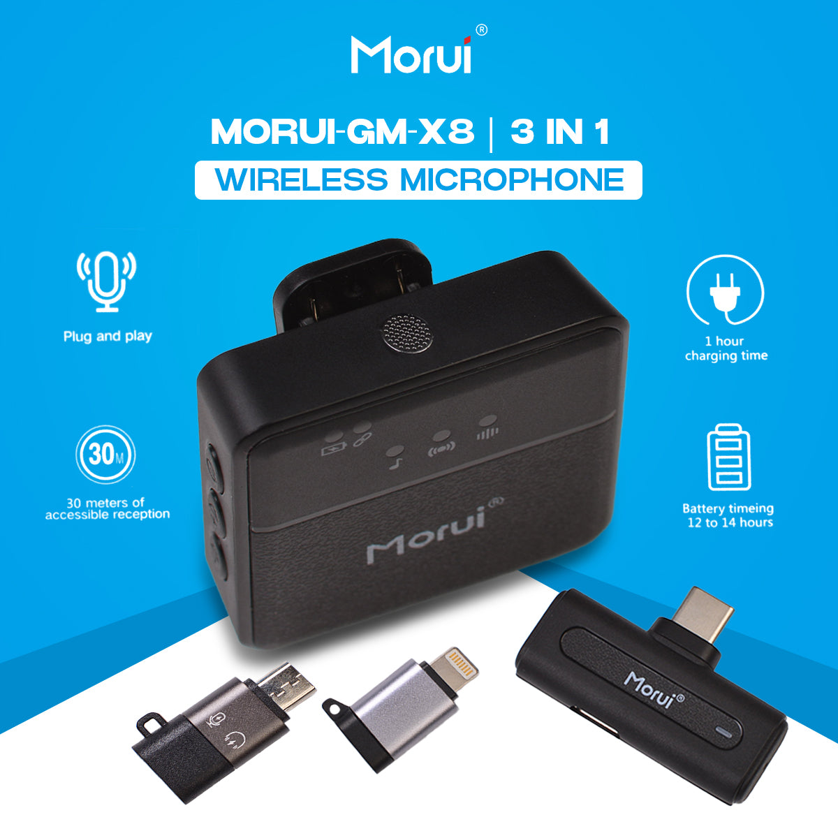 Morui GM-X8 Wireless Microphone – 3-in-1 Mic for Live Shows, Interviews, and Vlogging – Professional-Grade Noise-Canceling Mic